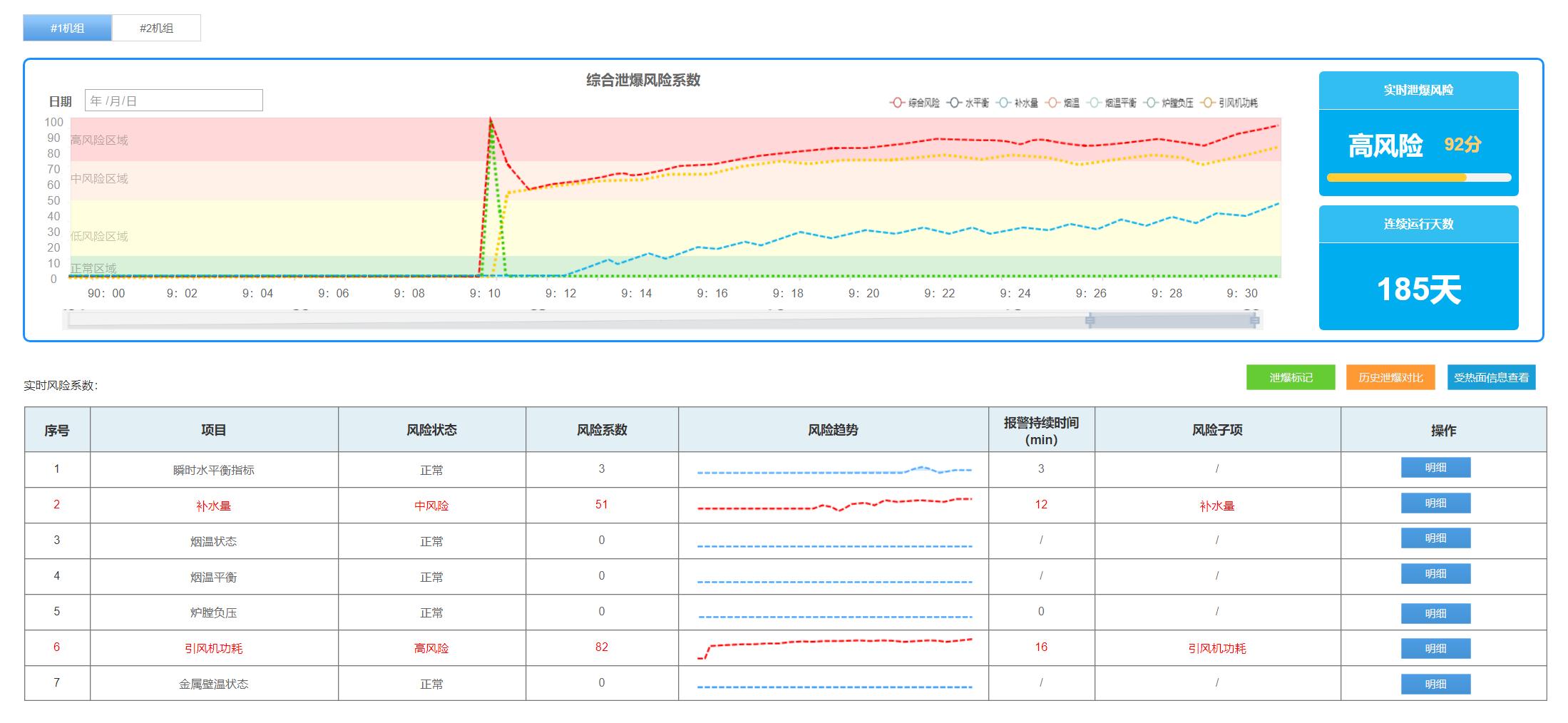 以系統的某電廠實際案例示例,該電廠防磨防爆可視化管理系統泄爆風險監控頁面顯示,1號鍋爐在上午9:10膛負壓指標、綜合風險指標突然上升,隨后爐膛負壓風險指標逐漸下降,同時引風機功耗、水平衡指標先后逐漸升高。點擊相關異常項目,分析風險指標的發展曲線以及歷史數據偏離特征后,初步判定為鍋爐爐膛水冷壁可能存在泄爆,立刻協調人員進行現場勘查。